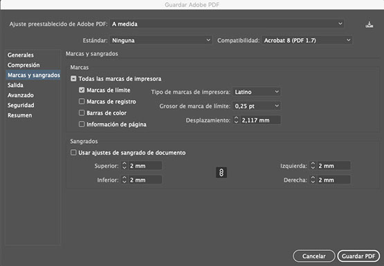 Es necesario dejar al menos 2 mm de sangre por lado (5 mm en el caso de revistas).